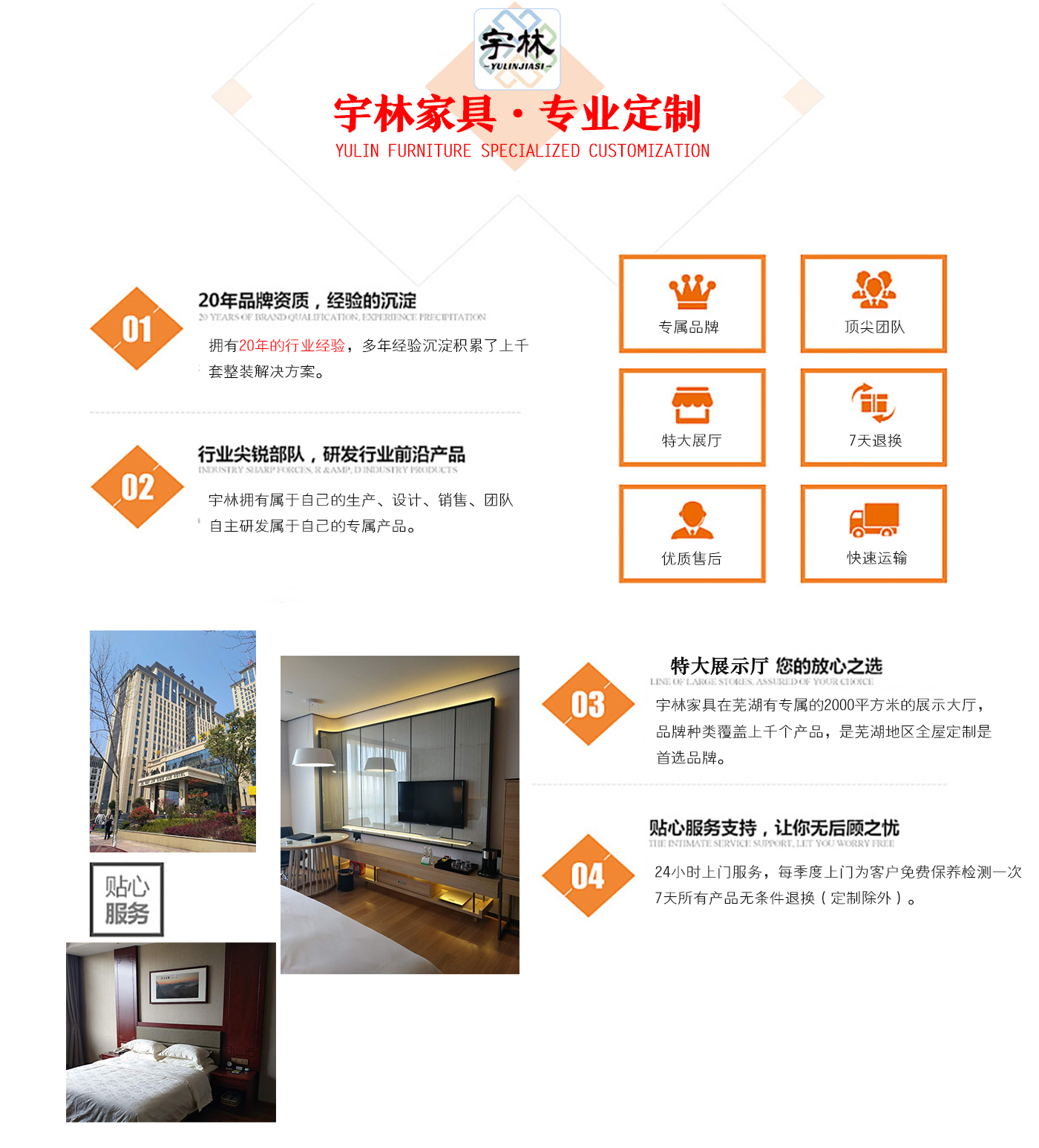 蕪湖宇林工貿(mào)有限公司創(chuàng)建于1996年,位于蕪湖高新技術(shù)開發(fā)區(qū)南區(qū),占地面積13000余平方米。是一個集研發(fā)、設(shè)計為一體的綜合性公司,公司主營整體家居定制、酒店家具定制、娛樂場所配套家具以及軟體系列,團(tuán)隊,銳意革新、進(jìn)去不息的理念,逐漸成為蕪湖家具行業(yè)的生產(chǎn)廠家,并在2006年注冊了“宇林”牌商標(biāo)。宇林品牌家具依現(xiàn)代與古典相結(jié)合的多種實(shí)木家具、實(shí)木貼皮家具。家具做工精細(xì),多用人工雕刻;其自然、典雅的風(fēng)格在很大程度上引導(dǎo)著人...
